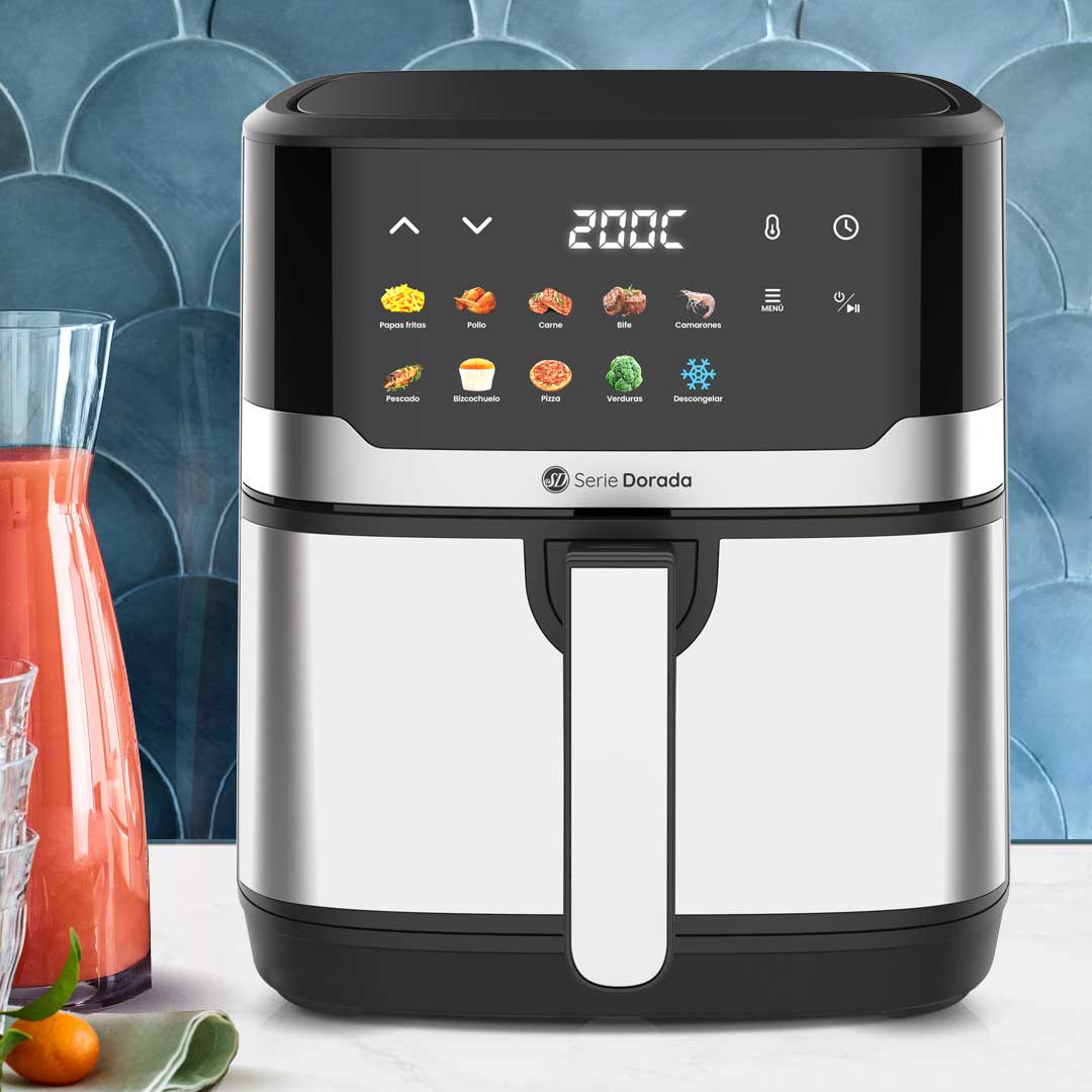 Transforma tu cocina con la elegante Freidora Digital Color Táctil, su cuerpo frontal de acero inoxidable y exclusivo display colorido, capacidad de 7,5 litros y cocción sin aceite para platos crujientes y jugosos.